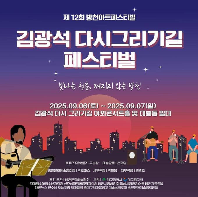 (아름다운교육신문) 대구 중구는 9월 6일부터 7일까지 양일간 김광석다시그리기길과 방천시장 일원에서 ‘2025 김광석다시그리기길 페스티벌(제12회 방천아트페스티벌)’을 개최한다.