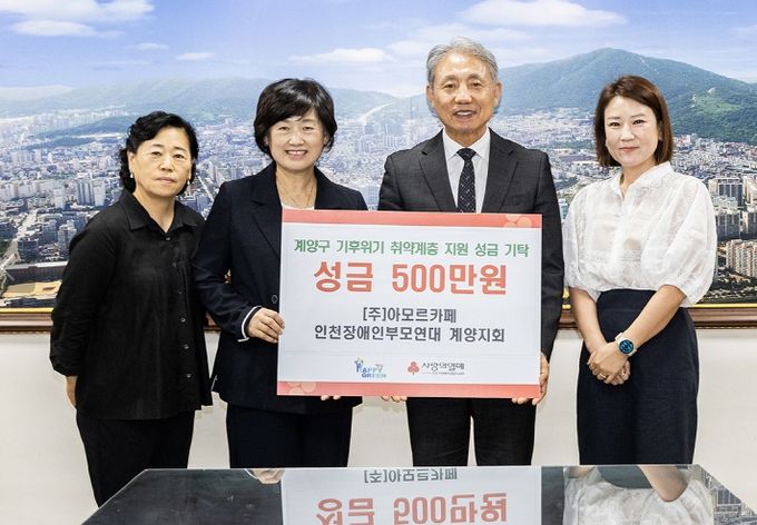 (아름다운교육신문) 인천광역시 계양구는 9일 ㈜아모르카페 인천장애인부모연대 계양지회가 기후위기 영향으로 어려움을 겪는 저소득·취약계층 지원을 위해 성금 500만 원을 기탁했다고 밝혔다.