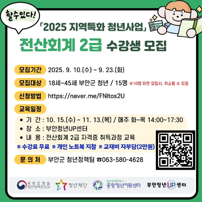 (아름다운교육신문) 부안청년UP센터는 지역 청년들의 회계 실무 능력 향상과 전문 자격 취득을 지원하기 위해 오는 10월부터 운영할 전산회계 2급 자격증반 수강생을 모집한다.