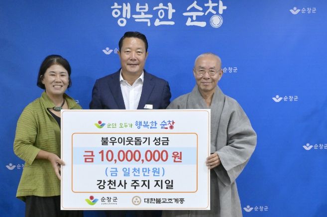 최근 강천사 지일 스님은 순창군청을 찾아 저소득 아동과 문화소외 계층을 위해 써달라며 성금 1천만원을 최영일 군수에게 전달했다.