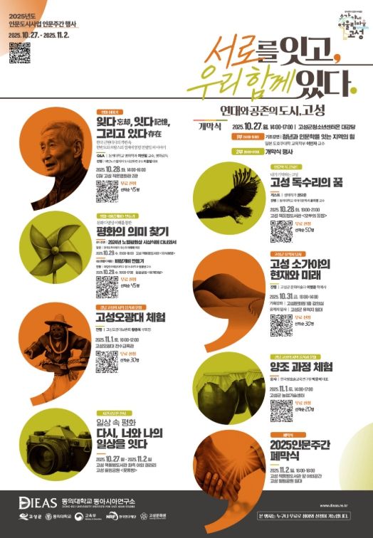 이상근 고성군수는 “이번 인문도시사업 인문주간 행사는 다양한 세대와 계층이 함께 어울릴 수 있는 교류의 장이자, 지역사회에 인문학적 소통과 협력, 공존의 가치를 심은 뜻깊은 계기”라며, “고성군민 여러분을 비롯해 누구나 이 의미 있는 행사에 많이 찾아오셔서, 계절의 아름다움과 사람내음, 인문학적 감성을 함께 만끽하시길 바란다”라고 전했다.