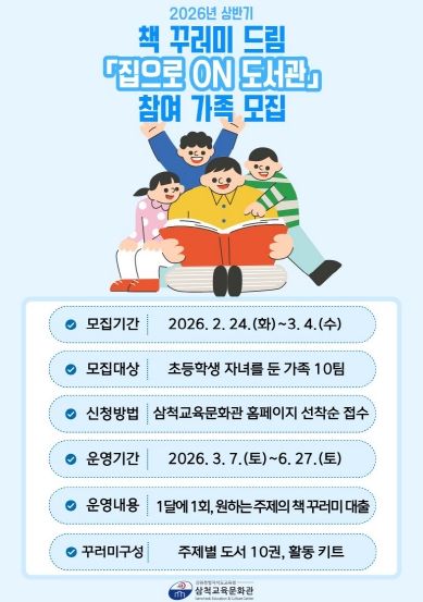 (아름다운교육신문) 삼척교육문화관은 3월부터 6월까지 가족 단위 독서 문화를 장려하기 위하여 초등학생 자녀를 둔 가족을 대상으로 책 꾸러미 드림 ‘집으로 온(ON) 도서관’을 운영한다.