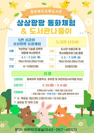 두 프로그램 모두 충북지역 초등학교와 유치원, 어린이집(48개월 이상)을 대상으로 하며, 신청은 23일부터 3월 6일까지 교육도서관 누리집을 통해 선착순 접수로 진행된다.