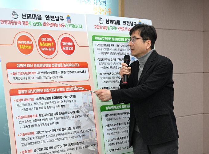 (아름다운교육신문) 울산 남구는 24일 남구청 프레스센터에서 정례브리핑을 열고 재난의 대형화·복합화와 기후변화에 따른 자연재난 증가에 대응하기 위해 재난안전국 중심의 통합 안전관리 체계 구축과 재해예방 인프라 확충을 포함한 2026년 종합 재난안전 정책을 본격 추진한다고 밝혔다.