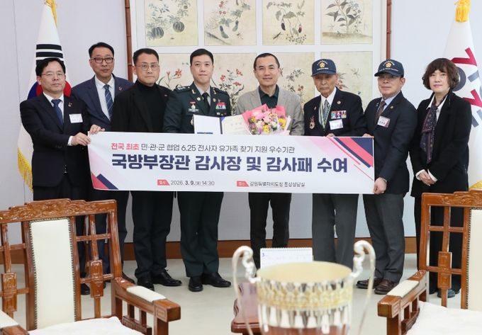 (아름다운교육신문) 강원특별자치도는 국방부 유해발굴감식단이 추진한 ‘2025년 민·관·군 협업 6·25전사자 유가족 집중 찾기’ 사업에서 전국 최초 민관군 협업 6.25전사자 유가족 찾기 지원 우수기관으로 선정돼, 3월 9일 국방부장관으로부터 감사장과 감사패를 수상했다고 밝혔다.