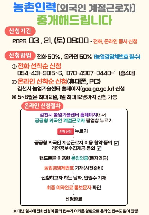 (아름다운교육신문) 김천시가 농번기 인력난 해소를 위해 오는 3월 21일 오전 9시부터 ‘2026년 공공형 외국인 계절근로자’ 신청을 받는다고 밝혔다.