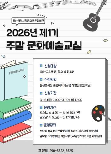 (아름다운교육신문) 울산학생교육문화회관은 오는 4월 4일부터 5월 17일까지 울산 지역 초등학교 5학년부터 고등학교 3학년 학생을 대상으로 ‘2026년 제1기 주말 문화예술 교실’을 운영한다.