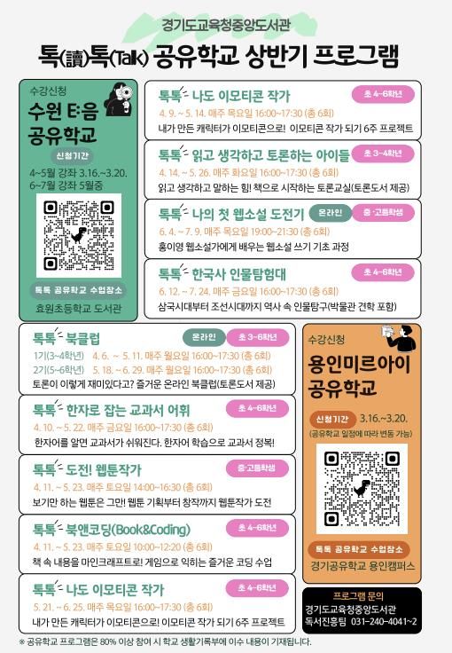 (아름다운교육신문) 경기도교육청중앙도서관이 학생들의 창의적 사고력과 진로설계 역량을 강화하기 위해 4월부터 7월까지 녪년 상반기 톡(讀)톡(talk) 공유학교’를 운영한다.