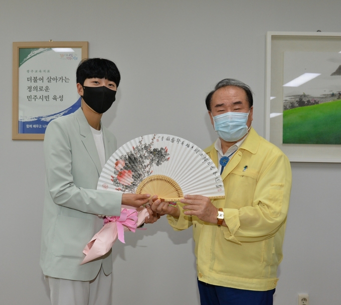 장휘국 교육감이 지난 3일 오후 광주시교육청을 방문한 2020 도쿄올림픽 ‘양궁 3관왕’ 안산 선수를 환영했다고 밝혔다.