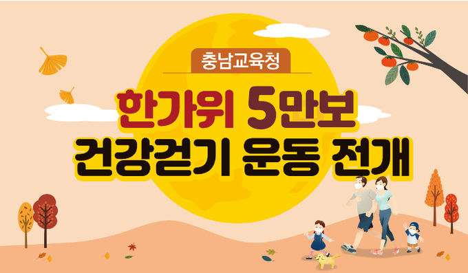 충남교육청은 추석 연휴에 도내 모든 학생과 교직원을 대상으로 '한가위 5만보 건강걷기 운동'을 전개한다고 13일 밝혔다.