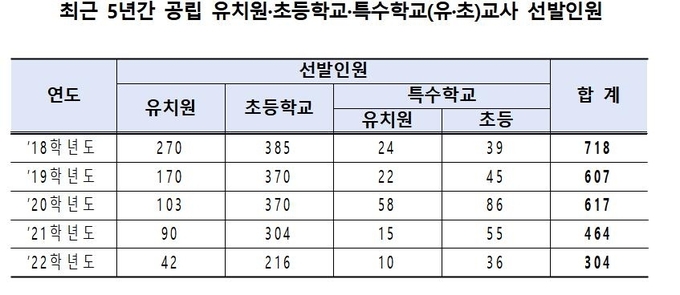 초등 교사는 304명에서 216명으로, 유치원 교사는 90명에서 42명으로, 유치원 특수교사는 15명에서 10명으로, 초등 특수교사는 55명에서 36명으로 일제히 줄었다.