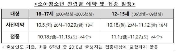 16~17세(2004~2005년생)는 10월 5일(화)부터 10월 29일(금)까지 사전예약 후, 10월 18일(월)부터 11월 13일(토)까지 접종하며, 12~15세(2006~2009년생)의 예약 및 접종은 각각 2주 뒤에 시작된다.