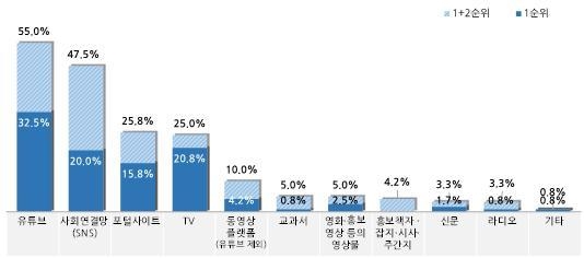 유튜브로 접한 가짜뉴스가 32.5%로 가장 많았고, TV 20.8%, 페이스북 등 사회연결망 20.0%, 포털사이트 15.8% 순이었다.