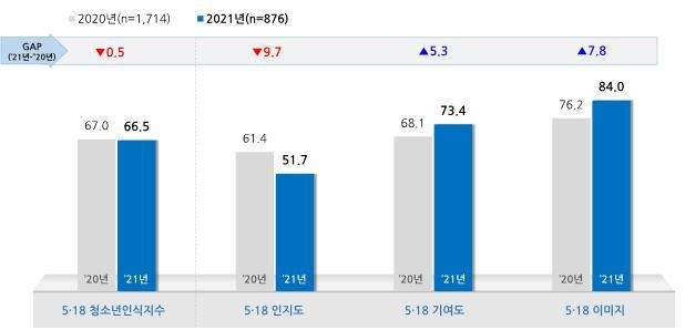 5·18기념재단은 여론조사 전문기관에 의뢰해 전국 중학교 2학년, 고등학교 2학년 학생 1천105명을 상대로 한 '2021년 청소년 5·18 인식조사'를 25일 발표했다.