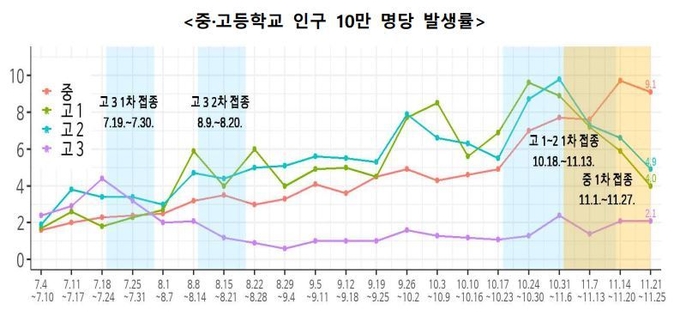 접종률이 높은 고3은 인구 10만 명당 발생률이 1·2차 접종 완료 이후 지속적으로 감소하여 전체적인 확진자 증가 상황에서도 다른 학년에 비해 낮은 발생률을 유지하고 있으며, 현재 접종 진행 중인 12~17세 중에서도, 접종률이 높은 고 1·2의 10만 명당 발생률은 11월 1주를 정점으로 지속 하락 하고 있어 접종 효과를 보여준다.