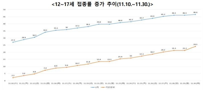 12월 1일(0시) 기준 12~17세 1차 접종자수는 약 130만 명으로, 인구 대비 1차접종률은 46.9%, 접종 완료율은 24.9%이며 점진적으로 증가 추세에 있다.