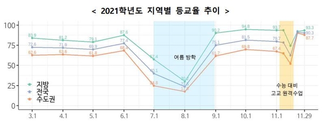 이러한 선제적 학교 일상회복 및 등교 확대 노력으로 작년 법정 수업일수 190일의 50% 수준이었던 등교율은, 올해 1학기에는 약 73%, 11월 22일(월) 전면등교 실시 이후 11월 29일(월) 기준으로 전국 평균 90.3%에 이르는 등 지속 증가해왔다.