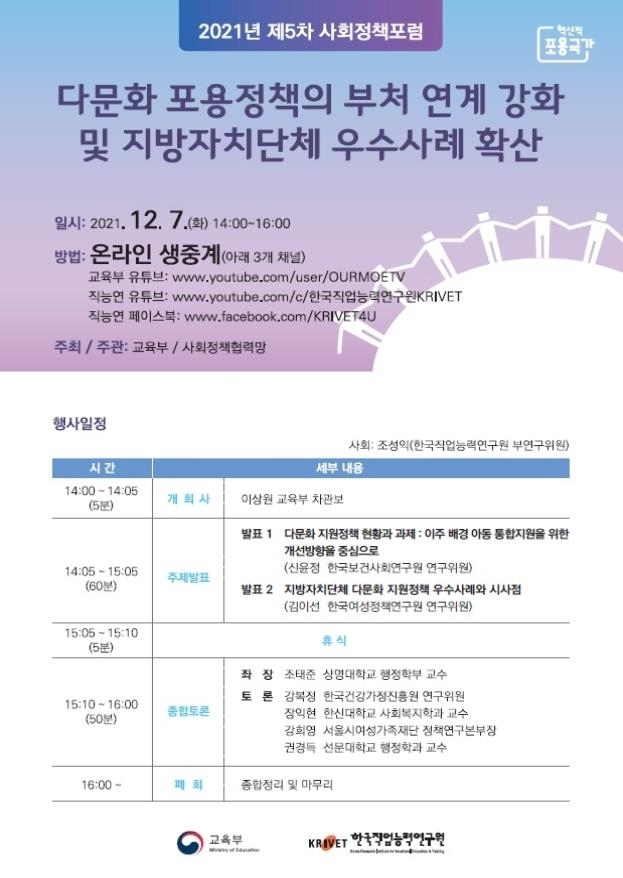 교육부는 한국직업능력연구원 등 사회 분야 연구기관과 ‘다문화 포용정책의 부처연계 강화와 지방자치 단체 우수사례 확산’을 주제로, 7일 오후 2시부터 제5차 공개토론회(포럼)를 개최한다.