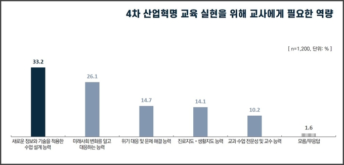 4차 산업혁명 시대 교육을 위해 교사에게 가장 필요한 역량으로는 ▲새로운 정보와 기술을 적용한 수업 설계 능력(33.2%), ▲미래사회 변화를 알고 대응하는 능력(26.1%), ▲위기 대응·문제 해결 능력(14.7%) 등을 꼽았다.