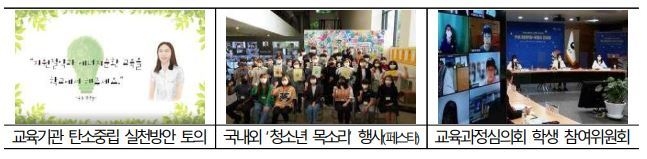 학생들이 학교텃밭·숲교육 등 자연을 직접 체감하고, 탄소 배출 점검(모니터링)을 통해 감축활동으로 연결되도록 하며, 지역사회와 연계한 환경교육 협력모형(모델) 개발·보급 등 생활 속 실천 중심 교육을 확대한다.