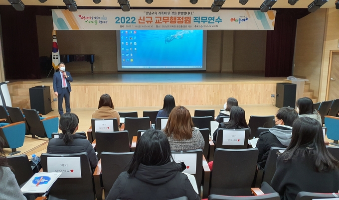 경남교육청(교육감 박종훈)은 3월 1일자로 신규 채용하는 교무행정원 16명을 대상으로 ‘2022년 신규 교무행정원 직무연수’를 18일 경남교육청 별관 3층 공감홀에서 열었다.