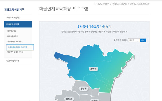 계양구 관내 학교는 계양마을교육 원클릭 시스템을 통해 계양마을교육단체 프로그램을 학교 교육과정에 맞는 단체 및 마을활동가와 연결을 지원한다.