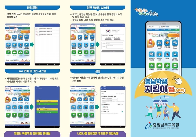 충남교육청(교육감 김지철)은 충남교육가족에게 다양하고 실질적인 안전 정보를 제공하기 위해 학생 대상 재난/안전관리 앱(App)인 ‘충남학생지킴이’ 의 기능을 보완·개선하여 21일부터 서비스를 개시한다고 밝혔다.