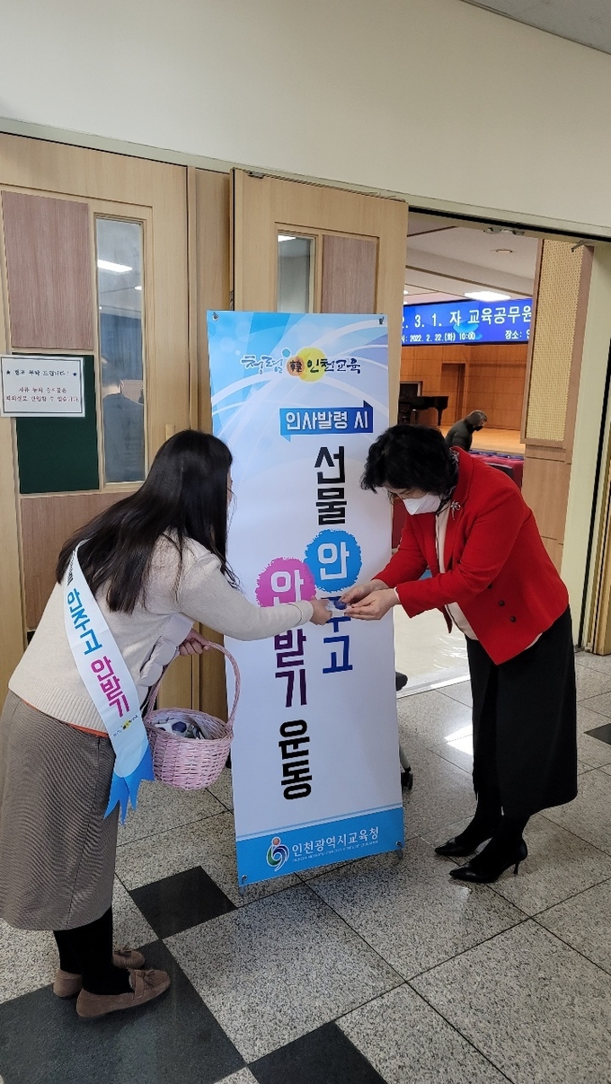 인천광역시교육청(교육감 도성훈)은 22일 교육공무원 인사발령에 따른 임용장 수여식에 참석한 유치원·초등·특수·중등 교육전문직원 및 관리직을 대상으로 ‘선물 안주고 안받기’ 청렴 캠페인을 실시했다.