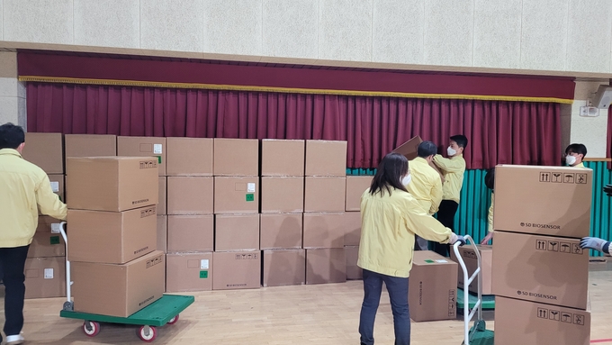 청주교육지원청 교직원 30명, 대한적십자사 충북지사 자원봉사자 56명 등 86명은 비닐장갑과 마스크를 쓰고 정부가 우선적으로 보내 온 5만5,000개 분량의 자가진단키트를 소분했다.