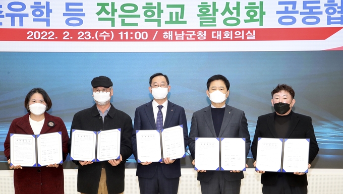 전라남도교육청(교육감 장석웅)과 해남군(군수 명현관), 현산·북일·계곡면 작은학교활성화추진위원회는 2월 23일(수) 해남군청 대회의실에서 농산어촌유학 등 작은학교 활성화 시범사업 추진을 위한 공동협약을 체결했다.