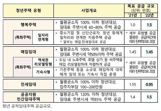 정부는 청년들의 주거 수요에 대응해 행복주택 등 안정적인 거주가 가능한 품질 좋은 임대주택 공급을 지속할 방침이다.