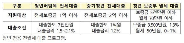 8만 청년가구에는 저금리로 전·월세 자금 대출을 지원할 방침이다. 청년전용 대출상품 금리는 전세자금 대출 1.2∼2.1%, 월세대출은 보증금 1.3%, 월세 0~1%로 낮게 책정한다. 월세대출 요건 중 소득은 2000만원에서 5000만원으로, 월세금은 60만원에서 70만원 이하 등으로 완화한다.