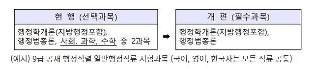 한편 올해부터 9급 공채 시험과목에서 직류별 전문과목이 필수화되고, 사회·과학·수학 등 고교 선택과목은 제외한다. 이에 따라 선택과목 간 점수 편차 조정을 위해 도입됐던 조정 점수제도 폐지된다.