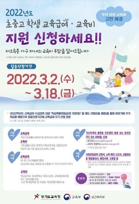 경기도교육청(교육감 이재정)이 다음 달 2일부터 18일까지 저소득층 학생 교육기회 보장과 교육비 부담 경감을 위해 교육급여와 교육비 지원 집중 신청 기간을 운영한다.