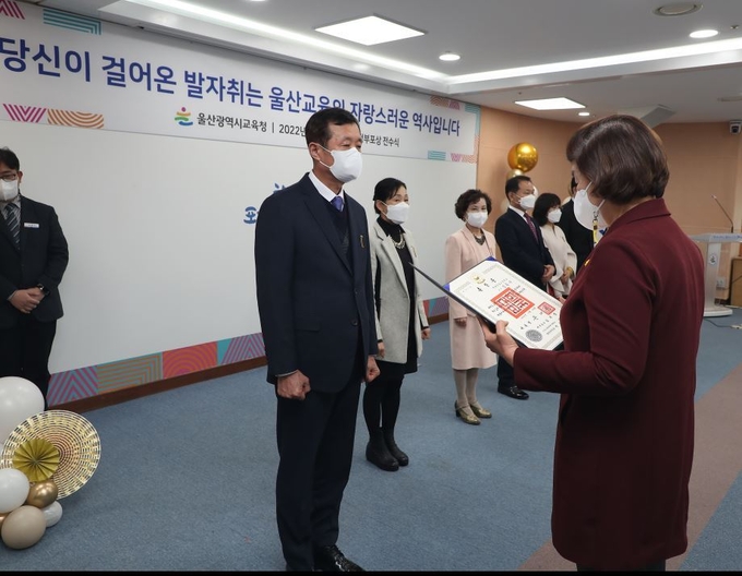 이번 전수식 행사는 오미크론 확산에 따른 방역 강화 조치로 희망자 18명만 참석했다. 내빈축하 인사는 울산광역시의회 교육위원회 손근호 위원장을 포함한 교직단체 등 축전으로 대신했다.