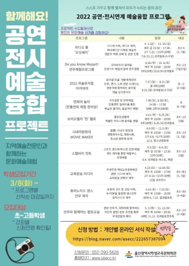 울산광역시학생교육문화회관(관장 장삼수)은 2022년 공연전시연계 예술융합프로그램 운영을 시작한다고 밝혔다.