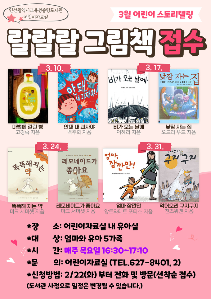 인천광역시교육청중앙도서관(관장 김용석)은 3월 부터 새롭게 단장한 중앙도서관 어린이자료실 유아실에서 유아 그림책 스토리텔링 '랄랄랄 그림책'을 운영한다고 밝혔다.