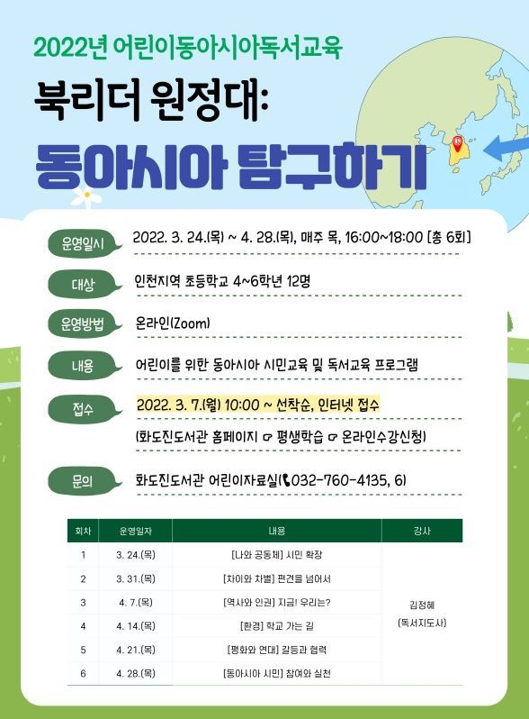 인천시교육청화도진도서관(관장 강신호)은 인천지역 초등 4~6학년을 대상으로 3월 24일(목)부터 4월 28일(목)까지 매주 목요일 ‘북리더 원정대: 동아시아 탐구하기’ 프로그램을 온라인(ZOOM)으로 운영한다.