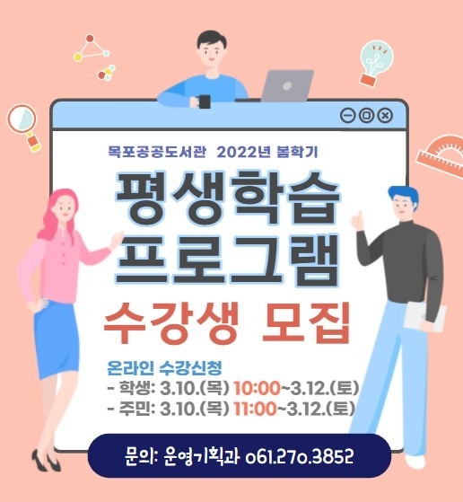 목포공공도서관(관장 오준경)은 2022. 봄학기 평생학습 프로그램 수강생을 모집한다.