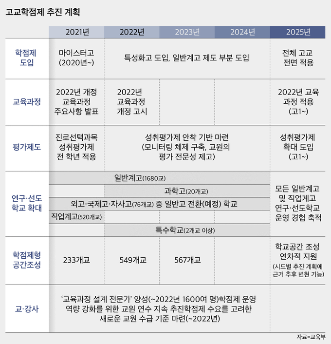 대학교처럼 원하는 과목을 선택할 수 있는 고교학점제는 올해 직업계고 학교에 먼저 도입됐으며, 일반고에는 2025년 전면 도입된다. 하지만 시도별로 올해부터 사실상 고교학점제를 도입한 지역이 많고 내년에는 거의 모든 고등학교에서 고1부터 적용할 예정이다. 수능을 포함해 입시 체계가 전면적으로 바뀌는 것은 2028학년도부터여서 '과도기'가 발생할 수밖에 없는 상황이다.