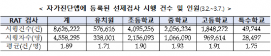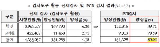 개학 첫 주(3월2~7일) 선제검사 결과를 자가진단앱에 입력한 학생은 총 394만6559명이며 이중 신속항원검사 키트에서 양성이 나온 인원은 16만9790명(양성률 4.3%)이다. PCR검사 결과 양성 판정을 받은 인원은 15만2316명이며 양성률은 약 89.71%에 달했다. 교직원까지 포함한 전체 양성률은 89.01%다.