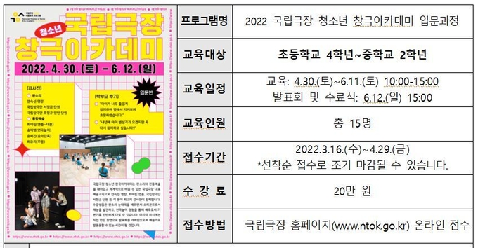 국립극장은 ‘2022 국립극장 청소년 창극아카데미(이하 ‘창극아카데미’)’ 수강생 모집을 3월 16일(수)부터 시작한다.