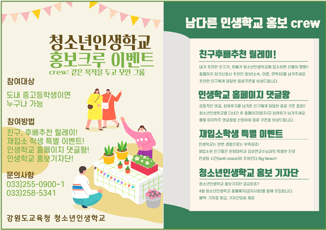 한편, 도교육청은 인생학교 홍보를 위해 상반기 교직원 및 학부모 대상 인생학교 워크숍을 집중 운영하고, 교육주체가 함께 만들어가는 홍보 이벤트도 진행할 예정이다.