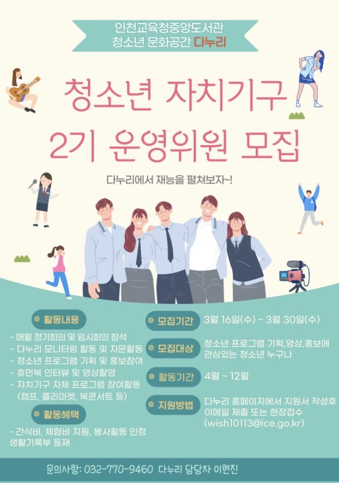 인천광역시교육청중앙도서관(관장 김용석) 소속 청소년문화공간 '다누리'는 청소년들이 주체가 되어 다양한 활동을 직접 기획하고, 의사결정에 참여하는 청소년 자치기구 '누리다' 2기 운영위원을 모집한다고 17일 밝혔다.