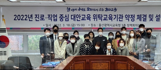 울산광역시교육청(교육감 노옥희)은 18일 학교 부적응 및 학업중단 위기 학생들의 학업중단 예방을 위해 진로‧직업 중심 대안교육 위탁교육기관으로 선정된 17개 위탁기관과 협약을 체결했다.