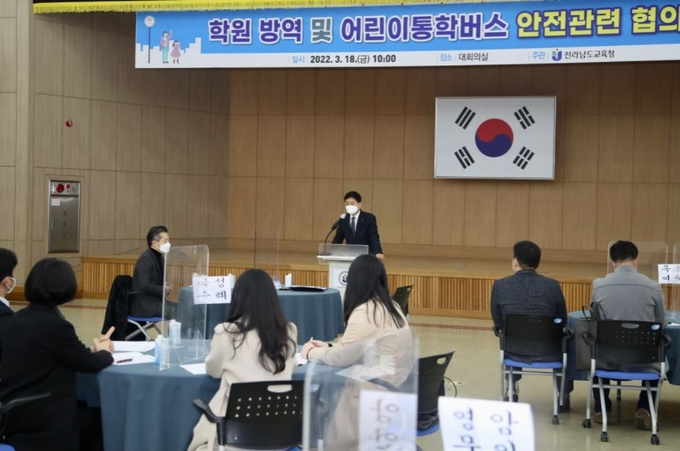 전라남도교육청(교육감 장석웅)이 3월 18일(금) 청사 2층 대회의실에서 학원방역 및 어린이 통학차량 안전관리 협의회를 갖고 코로나19 위기 속 새 학기를 맞은 학교정상화 방안을 모색했다.