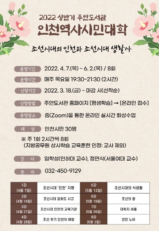주제는 <조선시대의 인천과 조선시대 생활사>로 임학성 인하대 교수와 정연식 서울여대 교수를 초빙해 4월 7일부터 6월 2일까지 매주 목요일 오후 7시 30분부터 9시 30분까지 진행된다.
