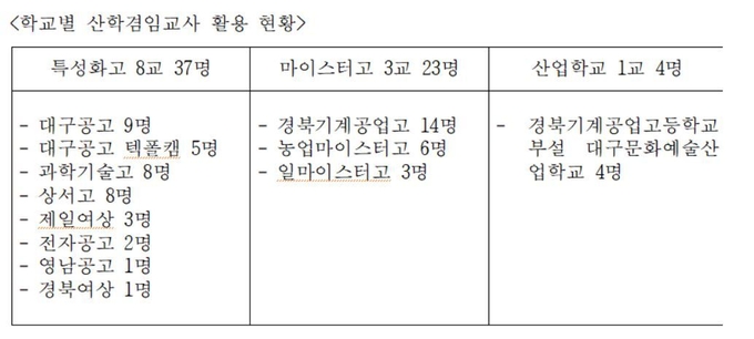 대구농업마이스터고 등 특성화고 8교에 37명, 경북기계공업고등학교 등 마이스터고 3교 23명, 경북기계공업고등학교 부설 대구문화예술산업학교 1교 4명 등 직업계고 12교에 64명을 지원하며, 해당 학교에는 산학겸임교사 인건비 총 2억 7천 7백만 원을 지원한다.
