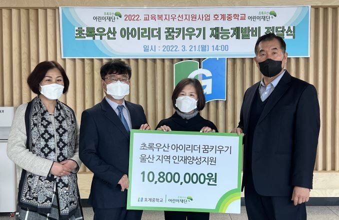 울산 호계중학교(교장 최귀라)는 21일 초록우산 어린이재단 울산지역본부(본부장 김동환)의 ‘아이리더 꿈 키우기’에 2년 연속 선정되어 졸업생 1명과 재학생 2명에게 총 1,080만 원의 꿈 지원 재능계발비 전달식을 가졌다.