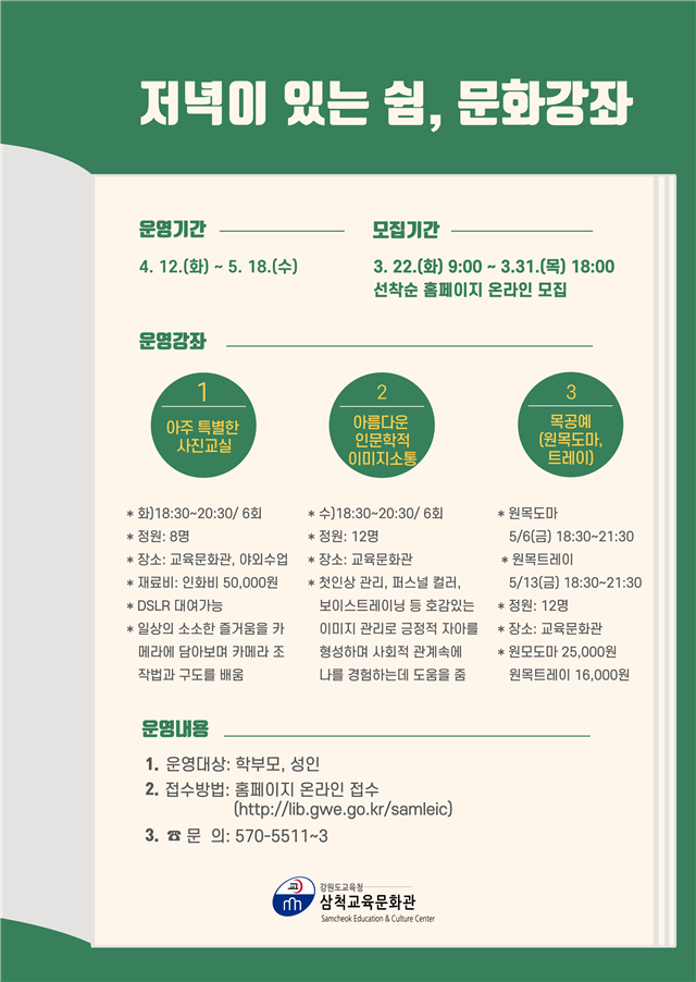 삼척교육문화관(관장 박영애)은 22일(화)부터 31일(목)까지 학부모, 성인을 대상으로 ‘저녁이 있는 쉼! 문화강좌’ 수강생을 모집한다.